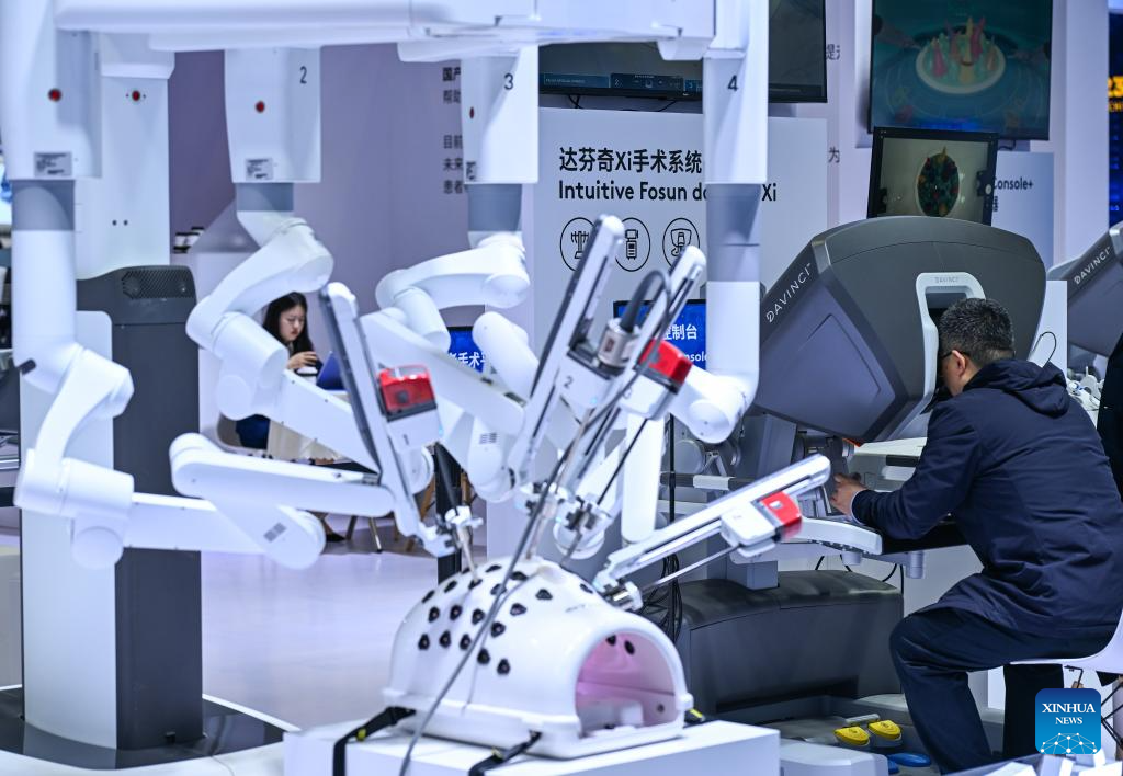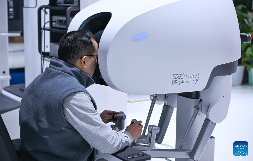 A visitor experiences surgical robot system during the 2025 China Medical Equipment Conference & Medical Equipment Exhibition held at Chongqing International Expo Center in southwest China's Chongqing Municipality, March 14, 2025. The four-day exhibition kicked off here on Thursday with a total of 34 professional exhibition areas, including medical imaging, radiotherapy, medical examination, surgical equipment, hospital Internet of Things construction, artificial intelligence and medical robots, etc., showcasing over 10,000 new products, new technologies, new applications and new methods in the field of medical equipment. (Xinhua/Wang Quanchao)