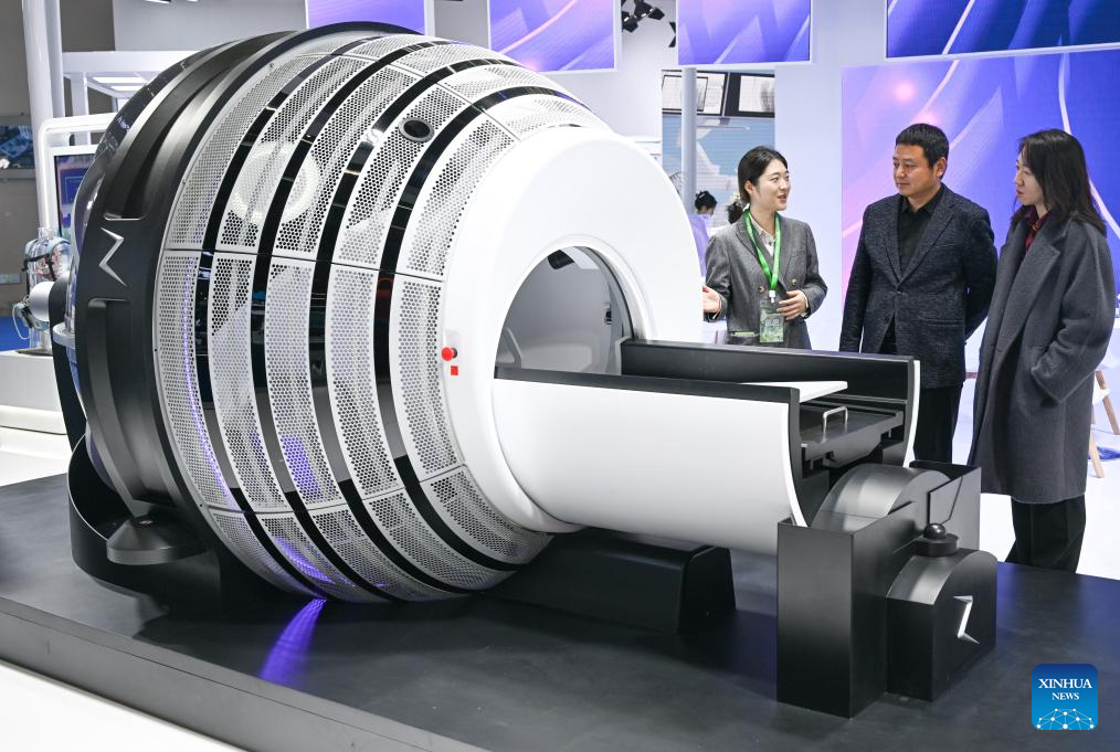 People visit the 2025 China Medical Equipment Conference & Medical Equipment Exhibition held at Chongqing International Expo Center in southwest China's Chongqing Municipality, March 14, 2025. The four-day exhibition kicked off here on Thursday with a total of 34 professional exhibition areas, including medical imaging, radiotherapy, medical examination, surgical equipment, hospital Internet of Things construction, artificial intelligence and medical robots, etc., showcasing over 10,000 new products, new technologies, new applications and new methods in the field of medical equipment. (Xinhua/Wang Quanchao)