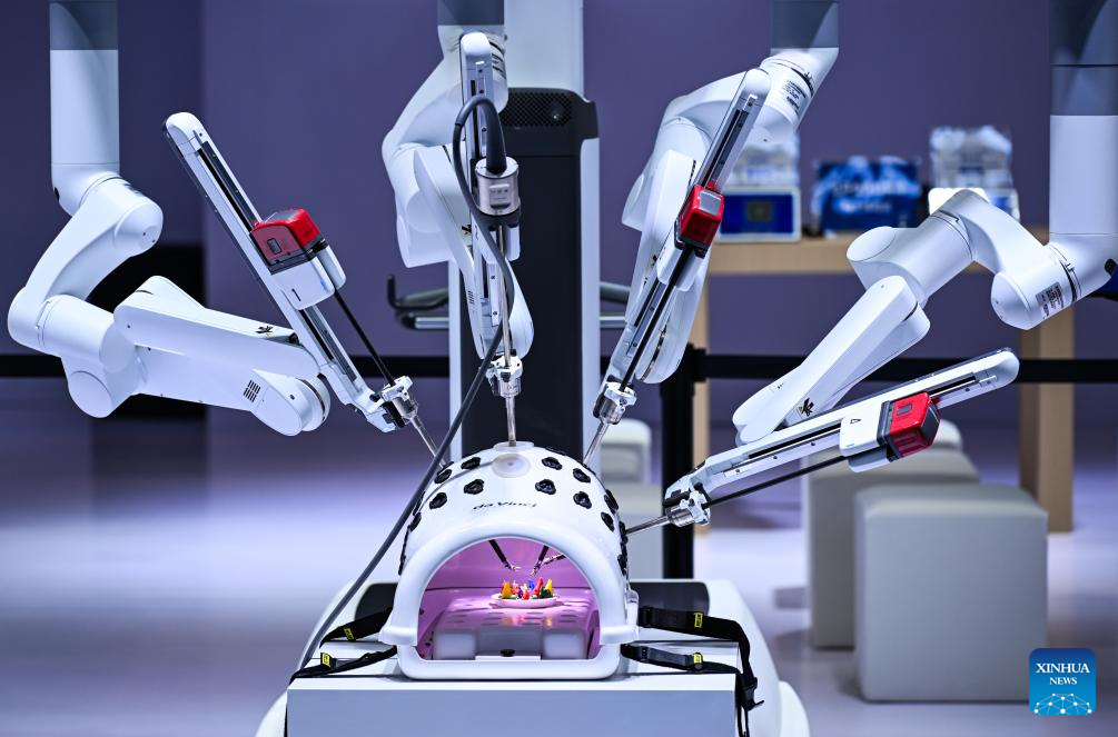 This photo taken on March 14, 2025 shows a surgical robot demonstration during the 2025 China Medical Equipment Conference & Medical Equipment Exhibition held at Chongqing International Expo Center in southwest China's Chongqing Municipality. The four-day exhibition kicked off here on Thursday with a total of 34 professional exhibition areas, including medical imaging, radiotherapy, medical examination, surgical equipment, hospital Internet of Things construction, artificial intelligence and medical robots, etc., showcasing over 10,000 new products, new technologies, new applications and new methods in the field of medical equipment. (Xinhua/Wang Quanchao)