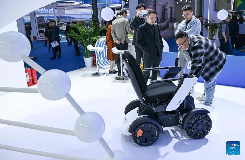Visitors view an intelligent wheelchair during the 2025 China Medical Equipment Conference & Medical Equipment Exhibition held at Chongqing International Expo Center in southwest China's Chongqing Municipality, March 14, 2025. The four-day exhibition kicked off here on Thursday with a total of 34 professional exhibition areas, including medical imaging, radiotherapy, medical examination, surgical equipment, hospital Internet of Things construction, artificial intelligence and medical robots, etc., showcasing over 10,000 new products, new technologies, new applications and new methods in the field of medical equipment. (Xinhua/Wang Quanchao)