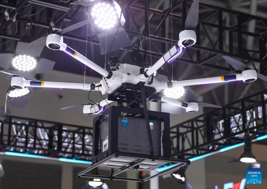 This photo taken on March 14, 2025 shows a "drone medical transport" demonstration during the 2025 China Medical Equipment Conference & Medical Equipment Exhibition held at Chongqing International Expo Center in southwest China's Chongqing Municipality. The four-day exhibition kicked off here on Thursday with a total of 34 professional exhibition areas, including medical imaging, radiotherapy, medical examination, surgical equipment, hospital Internet of Things construction, artificial intelligence and medical robots, etc., showcasing over 10,000 new products, new technologies, new applications and new methods in the field of medical equipment. (Xinhua/Wang Quanchao)
