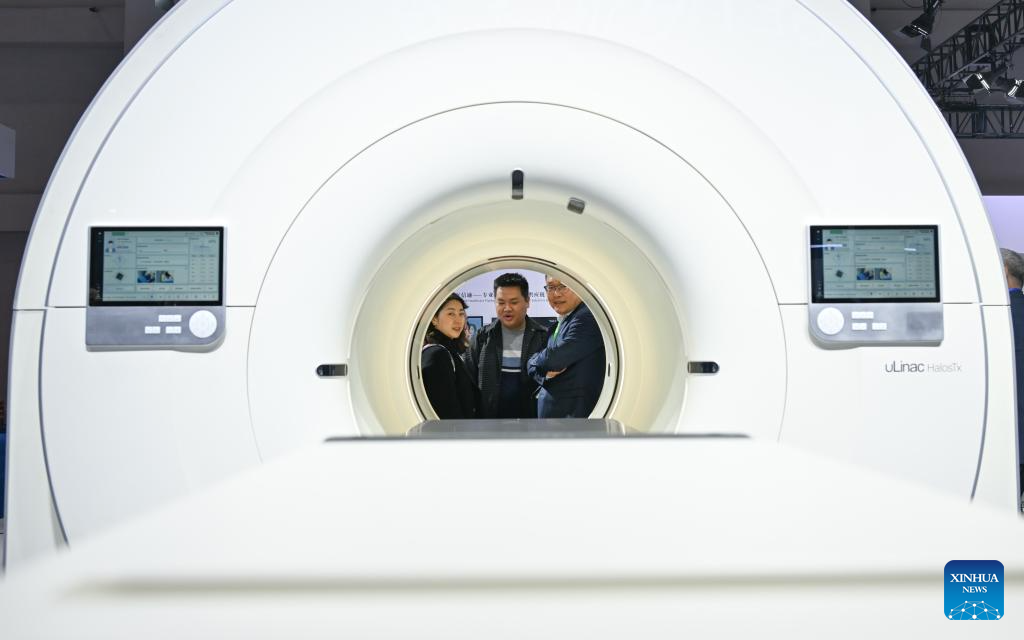 Visitors view a radiosurgical robot during the 2025 China Medical Equipment Conference & Medical Equipment Exhibition held at Chongqing International Expo Center in southwest China's Chongqing Municipality, March 14, 2025. The four-day exhibition kicked off here on Thursday with a total of 34 professional exhibition areas, including medical imaging, radiotherapy, medical examination, surgical equipment, hospital Internet of Things construction, artificial intelligence and medical robots, etc., showcasing over 10,000 new products, new technologies, new applications and new methods in the field of medical equipment. (Xinhua/Wang Quanchao)