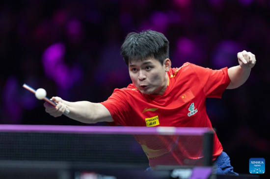 Wang Chuqin hits a return during the men's singles final between Wang Chuqin of China and Lin Shidong of China at the WTT Champions Chongqing 2025 in Chongqing, southwest China, March 16, 2025. (Xinhua/Huang Wei)