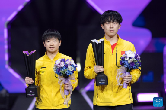Sun Yingsha (L) and Wang Chuqin of China pose for photos during the awarding ceremony of the WTT Champions Chongqing 2025 in Chongqing, southwest China, March 16, 2025. (Xinhua/Huang Wei)