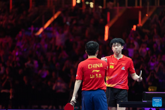 Wang Chuqin (L) hits a return during the men's singles final between Wang Chuqin of China and Lin Shidong of China at the WTT Champions Chongqing 2025 in Chongqing, southwest China, March 16, 2025. (Xinhua/Huang Wei)