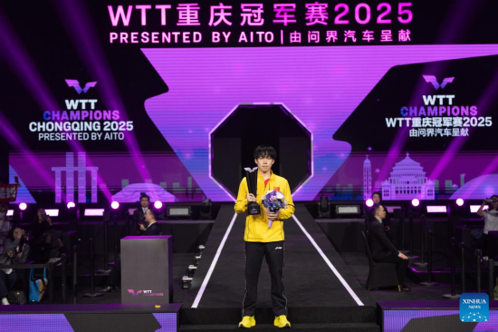 Wang Chuqin of China poses for photos during the awarding ceremony of the WTT Champions Chongqing 2025 in Chongqing, southwest China, March 16, 2025. (Xinhua/Huang Wei)