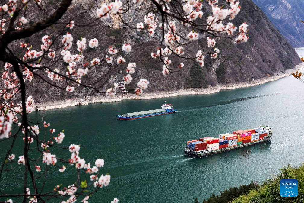 Ships sail in Wuxia Gorge, one of the Three Gorges on the Yangtze River, in Wushan County, southwest China's Chongqing, March 15, 2025. As the spring season is coming, flowers are in full bloom across the country. (Photo by Wang Zhonghu/Xinhua)