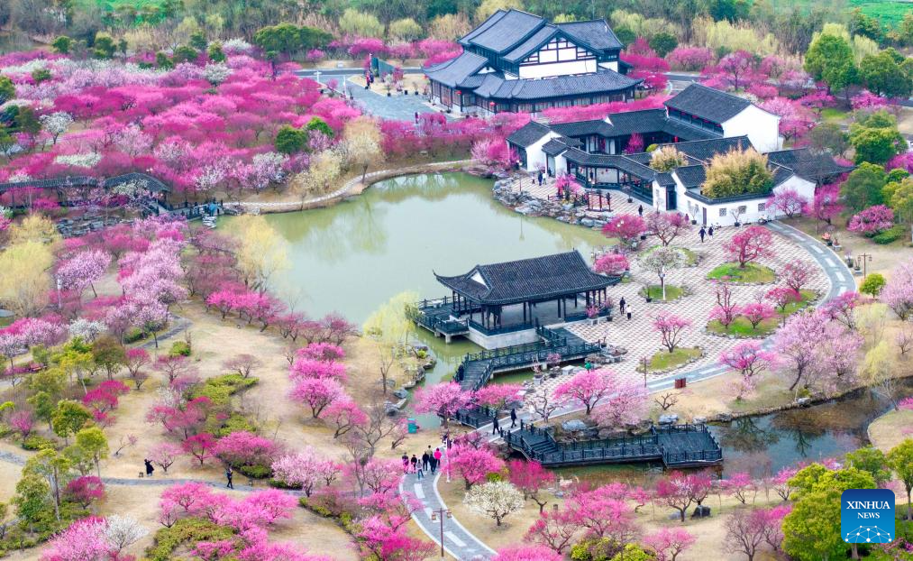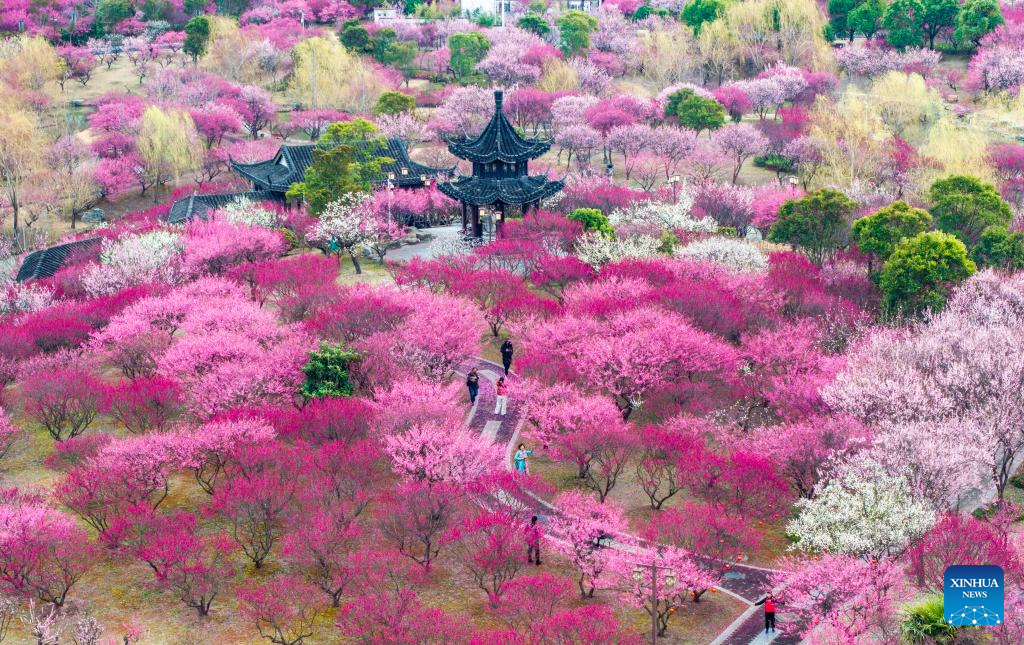 An aerial drone photo taken on March 15, 2025 shows tourists enjoying the scenery of flowers in blossom at a scenic spot in Yancheng City, east China's Jiangsu Province. As the spring season is coming, flowers are in full bloom across the country. (Photo by Zhou Shegen/Xinhua)