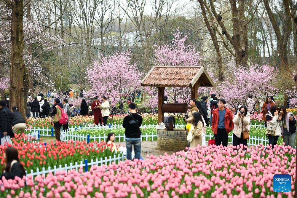 People visit a botanic garden in Nanjing, east China's Jiangsu Province, March 15, 2025. As the spring season is coming, flowers are in full bloom across the country. (Photo by Yang Suping/Xinhua)