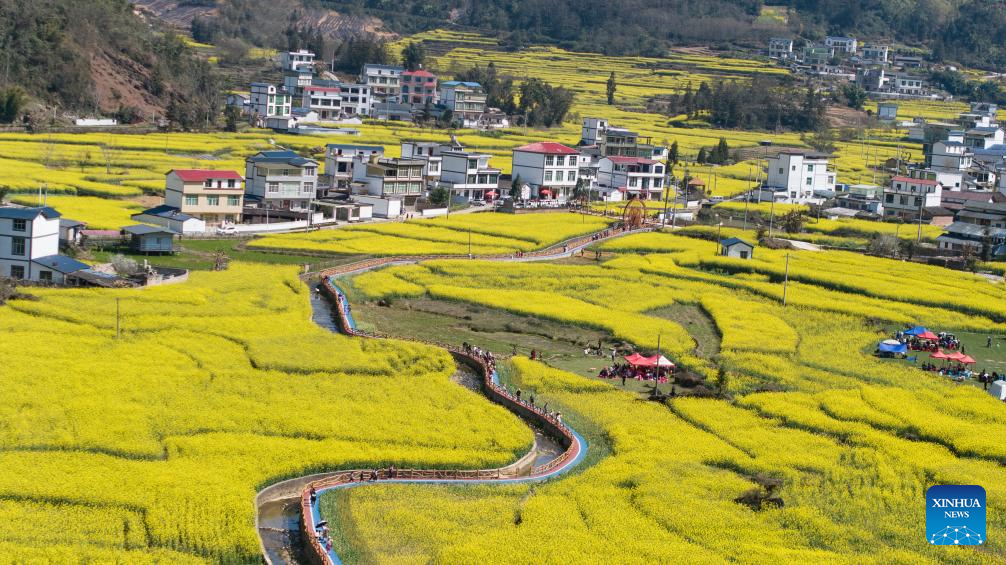 Rapeseed flowers in full blossom are pictured in Maguan County of Wenshan Zhuang and Miao Autonomous Prefecture in southwest China's Yunnan Province, March 14, 2025. As the spring season is coming, flowers are in full bloom across the country. (Photo by Xiong Pingxiang/Xinhua)