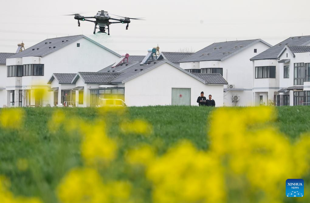A farmer operates a drone to spray pesticide in a field in Zhaozhuangzi Village, Cangzhou City of north China's Hebei Province, March 14, 2025. Various modern technologies are being used during the spring ploughing farm work across the country. (Photo by Zhou Yang/Xinhua)