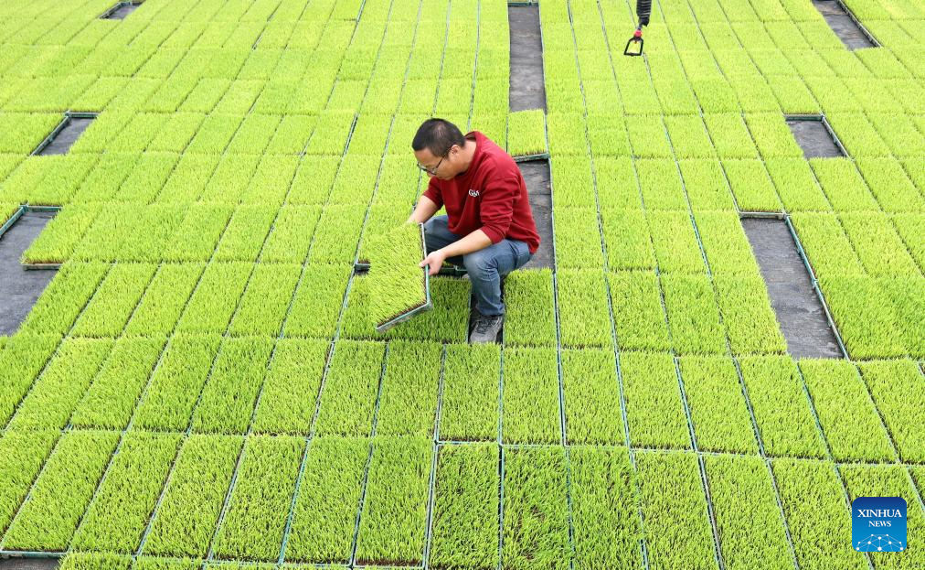 A worker checks the growth of paddy rice seedlings at a smart seedling cultivation factory in Dongheng Village, Huzhou City of east China's Zhejiang Province, March 14, 2025. Various modern technologies are being used during the spring ploughing farm work across the country. (Photo by Xie Shangguo/Xinhua)