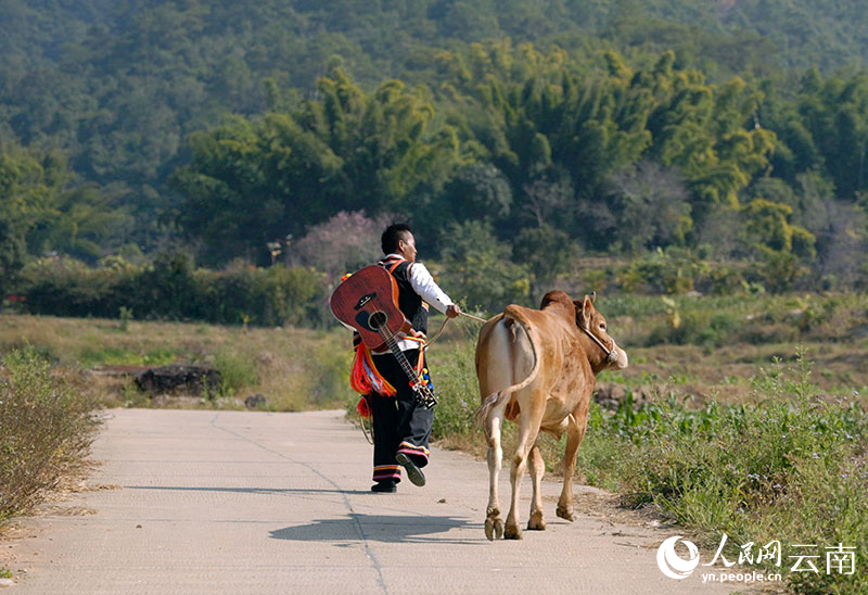 A villager herds cattle while carrying a guitar on his back in Laodabao village, Jiujing township, Lancang Lahu Autonomous County, Pu'er city, southwest China's Yunnan Province. (Photo/Jia Xiang)