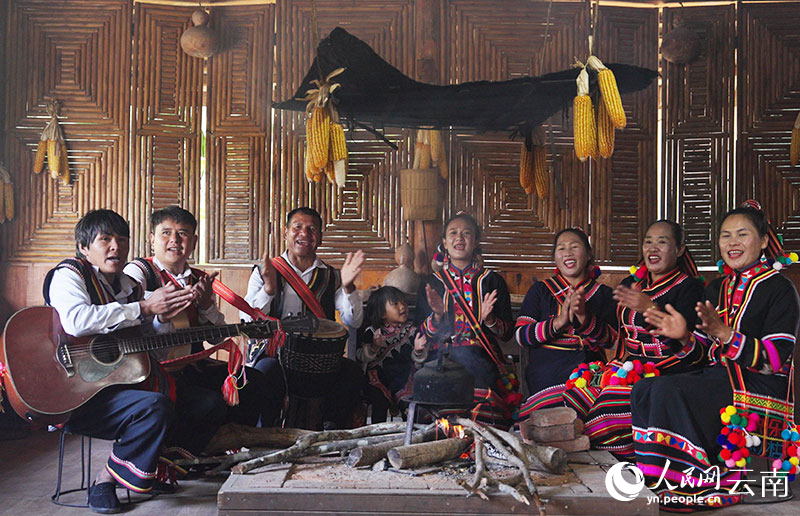 Villagers sing and play musical instruments around the fireplace in Laodabao village, Jiujing township, Lancang Lahu Autonomous County, Pu'er city, southwest China's Yunnan Province. (Photo/Jia Xiang)