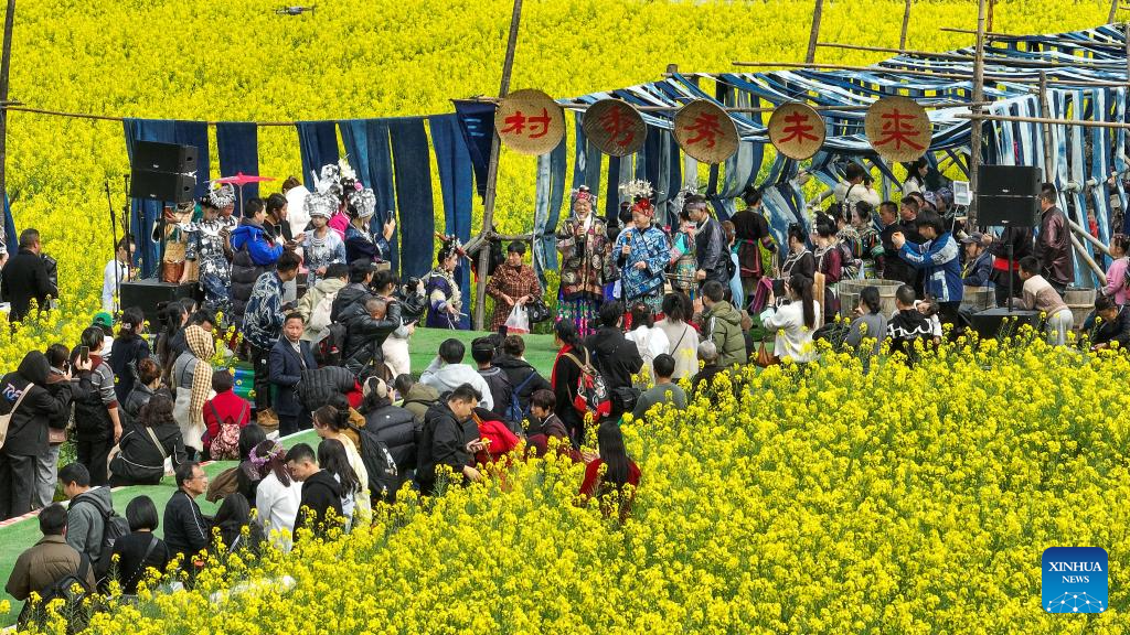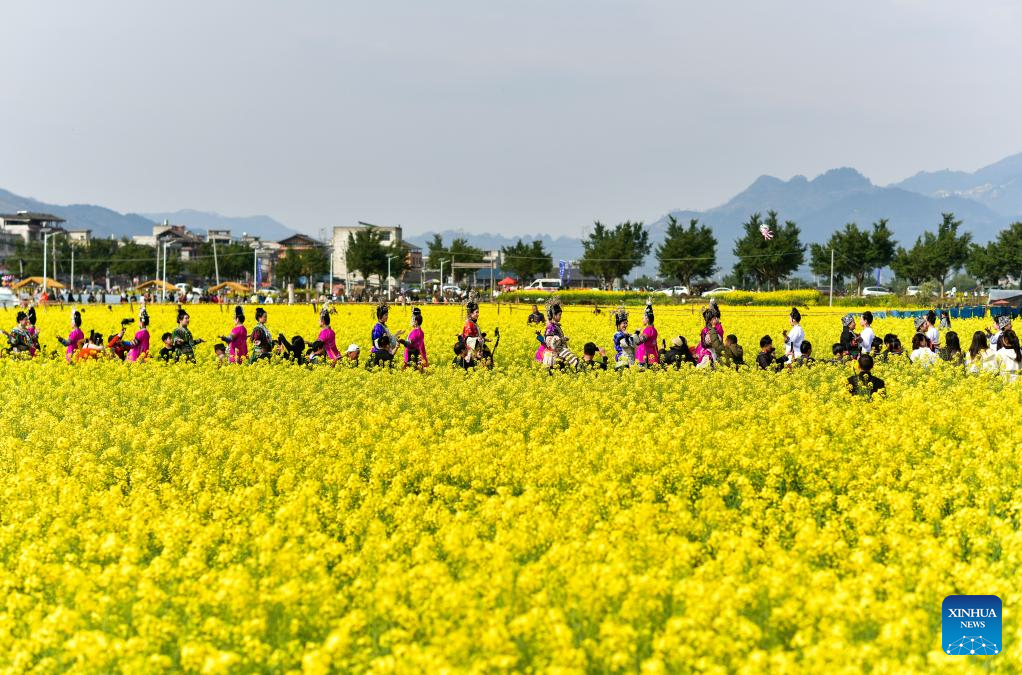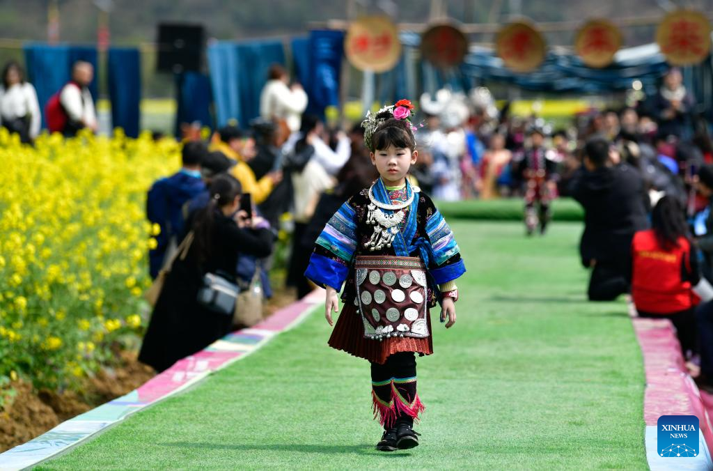 Villagers in ethnic costumes take part in a rural fashion show in Rongjiang County, southwest China's Guizhou Province, March 16, 2025.