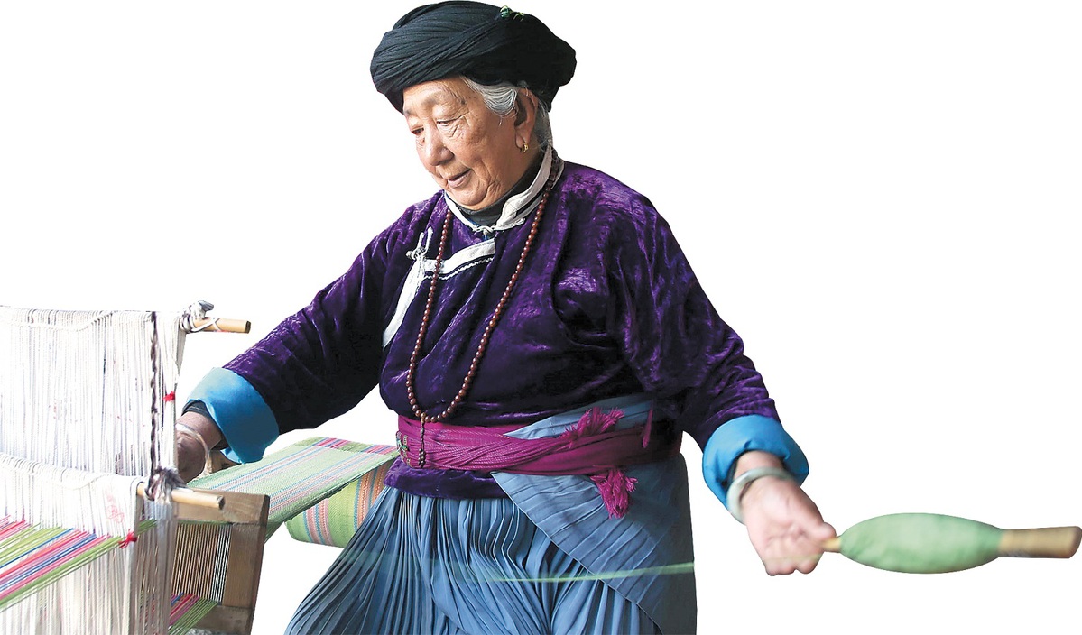 An inheritor of Mosuo traditional costume-making weaves cloth in a village by the Lugu Lake. (Wang Lei/China News Service)