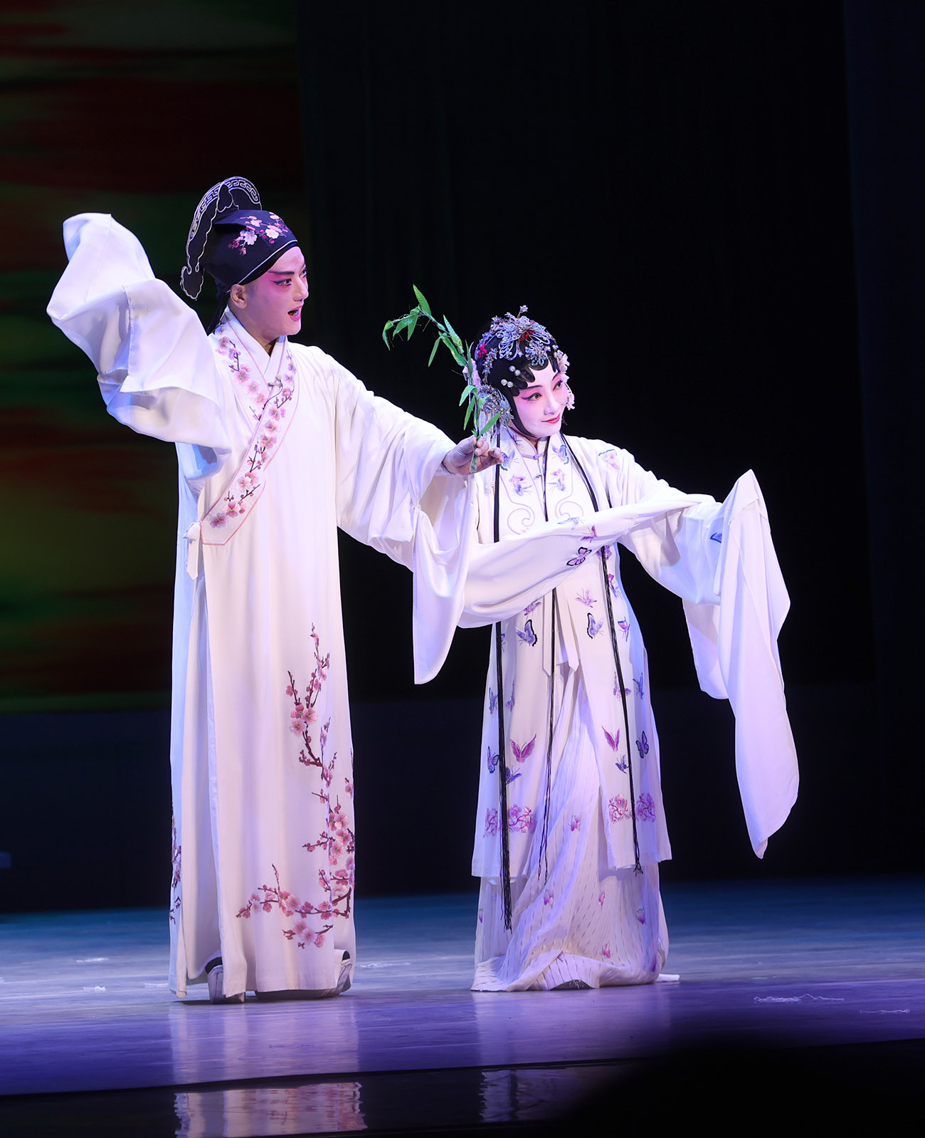 Kunqu Opera actor Yu Jiulin and actress Shen Fengying, who play hero Liu Mengmei and heroine Du Liniang in the youth version of The Peony Pavilion, at Peking University on September 16, 2024. (Photo/China Daily)