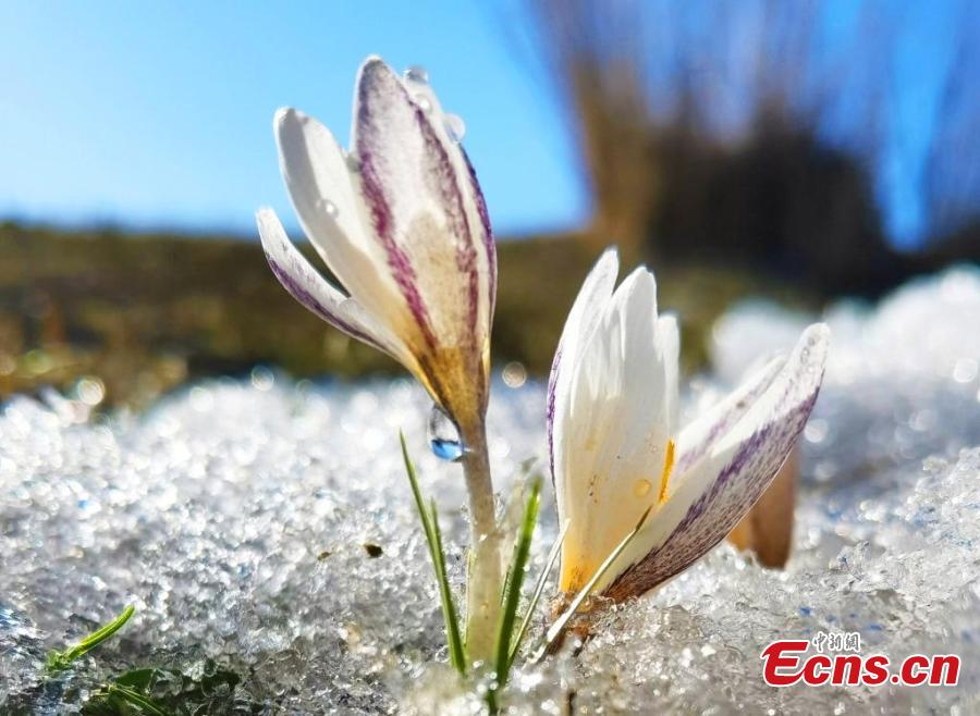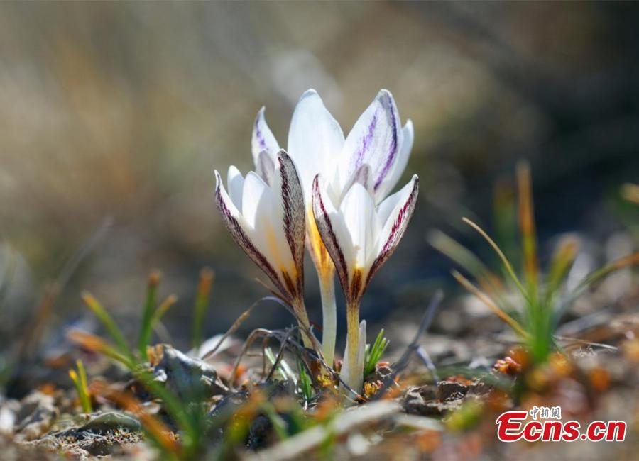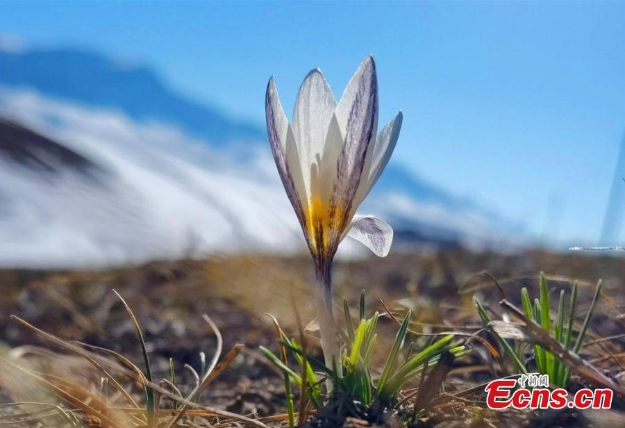 Wild lilies, also known as the top ice flowers, the first flower of spring in Xinjiang bloom on a meadow at an altitude of 1,200 meters to 3,000 meters, in the Ili Kazak Autonomous Prefecture, northwest China's Xinjiang Uygur Autonomous Region. (China News Service/Gong Xinyu)