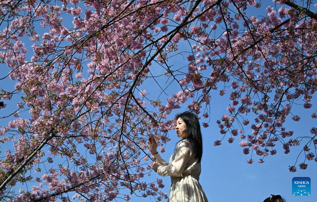 A tourist enjoys the scenery of cherry blossoms at Donghu Lake in Wuhan, central China's Hubei Province, March 18, 2025. (Xinhua/Cheng Min)