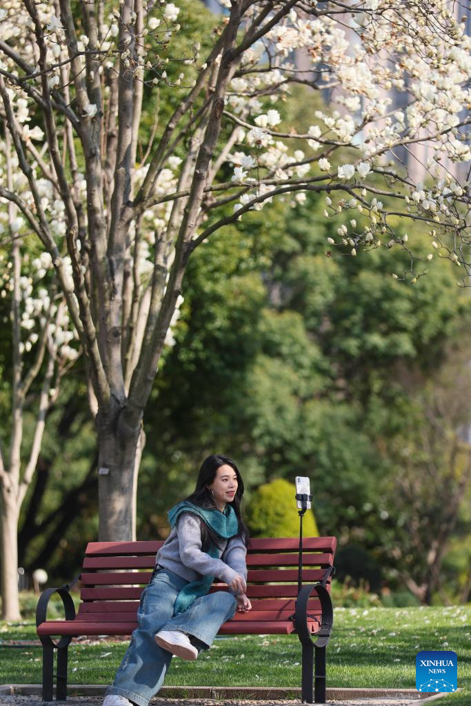 A tourist takes selfies under a magnolia tree in Lujiazui, east China's Shanghai, March 18, 2025. (Xinhua/Wang Xiang)