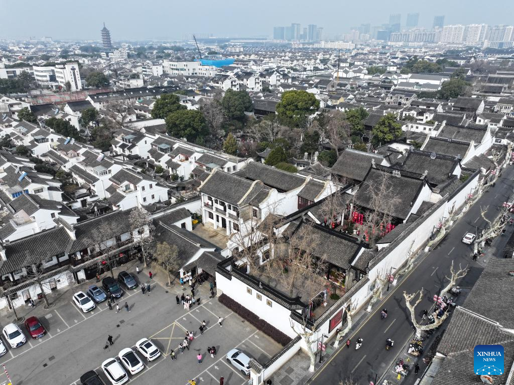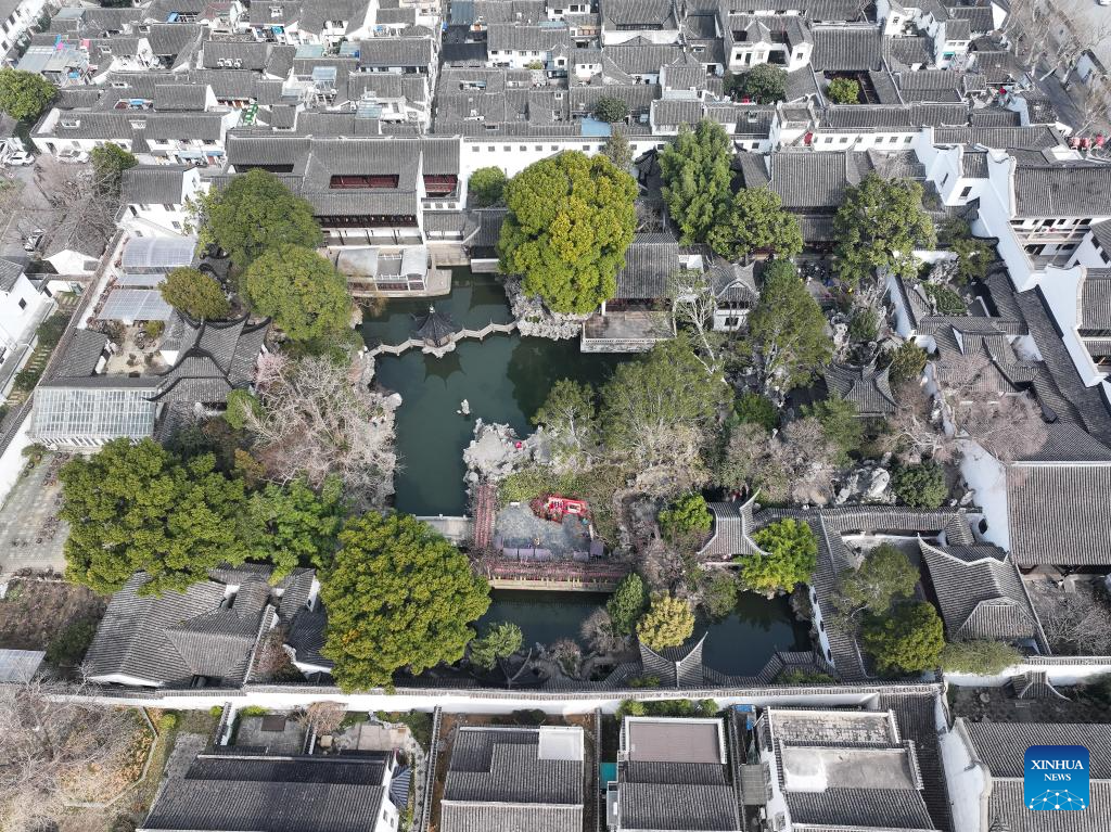 An aerial drone photo shows the scenery of the Lion Grove Garden and its surroundings in Suzhou, east China's Jiangsu Province, Feb. 26, 2025.