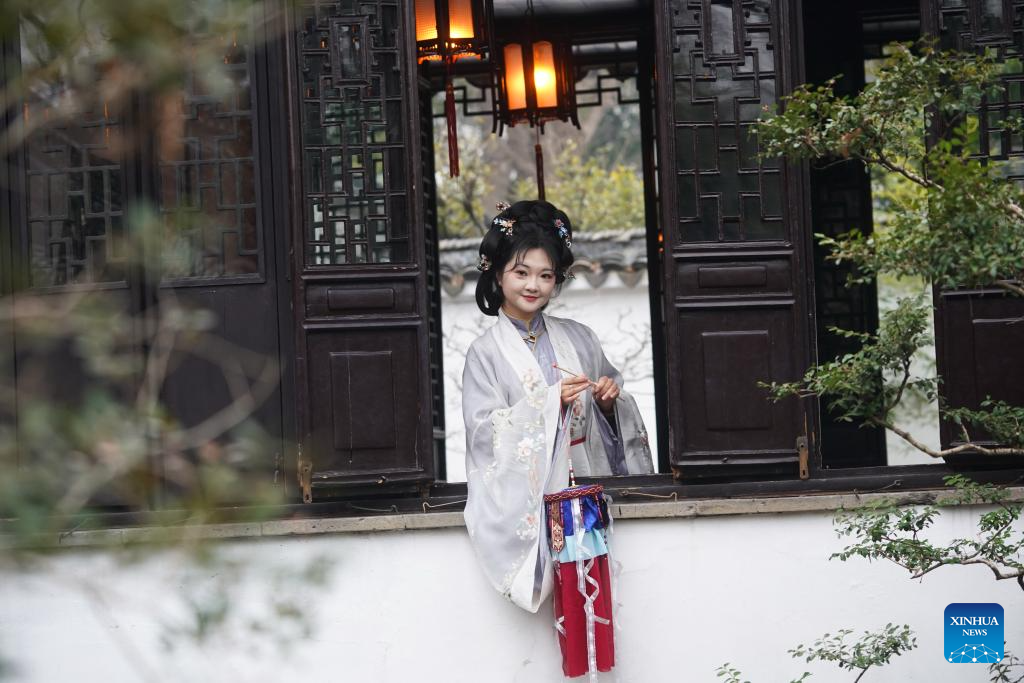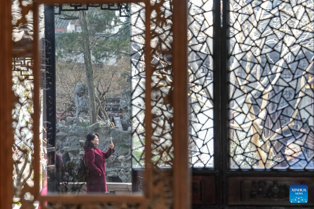 A tourist poses for a photo at the Humble Administrator's Garden in Suzhou, east China's Jiangsu Province, Feb. 25, 2025.