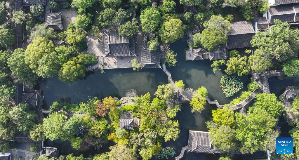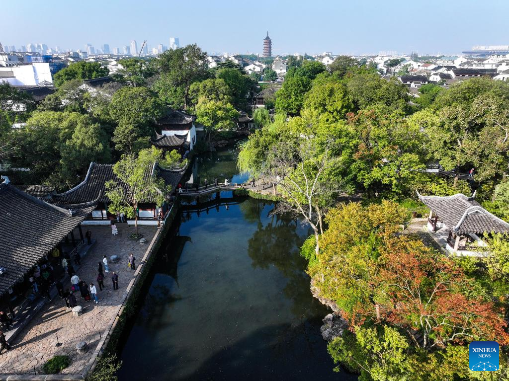 An aerial drone photo shows the scenery of the Humble Administrator's Garden in Suzhou, east China's Jiangsu Province, Oct. 23, 2024.