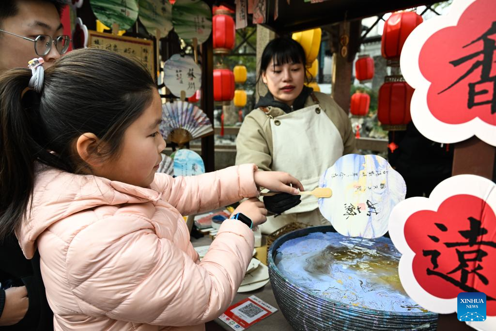 A girl makes a lacquer fan at the Lion Grove Garden in Suzhou, east China's Jiangsu Province, Feb. 26, 2025.