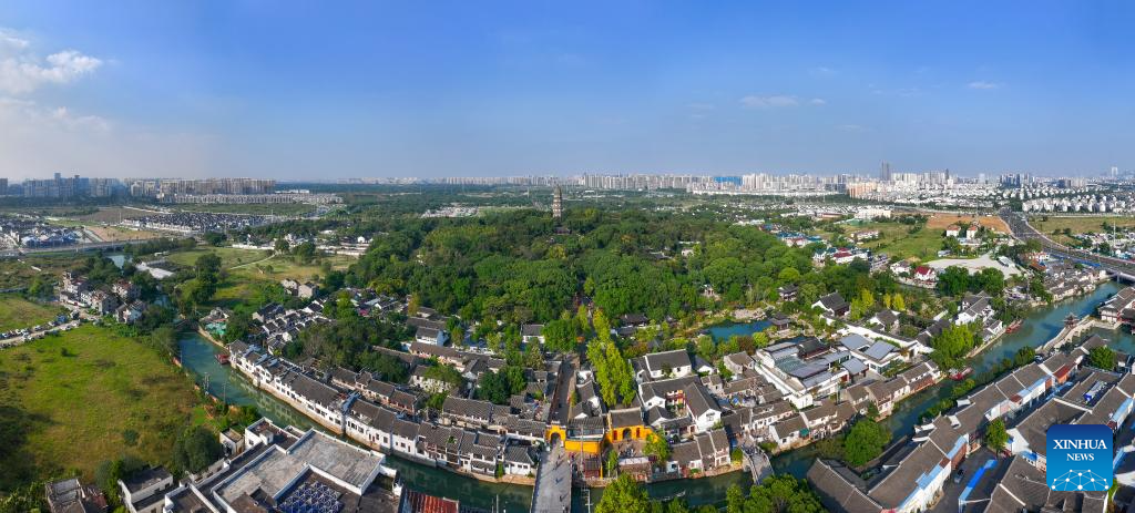 An aerial drone photo shows the scenery of the Huqiu scenic area in Suzhou, east China's Jiangsu Province, Oct. 23, 2024.