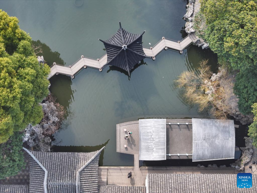 An aerial drone photo shows the scenery of the Lion Grove Garden in Suzhou, east China's Jiangsu Province, Feb. 26, 2025.