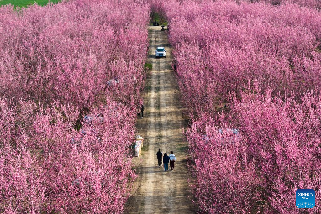 An aerial drone photo taken on March 18, 2025 shows tourists enjoying leisure time amid blooming plum flowers at a plantation in Huyi District of Xi'an, northwest China's Shaanxi Province. (Xinhua/Shao Rui)