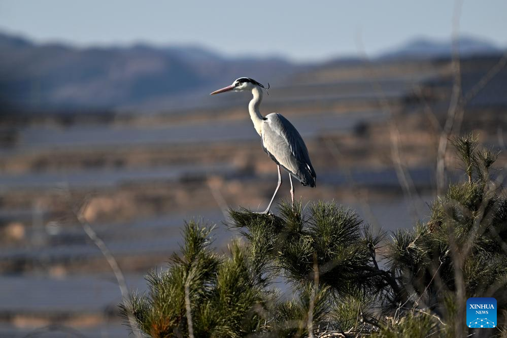 A heron perches on a tree in Jicui Town of Fangshan County, Lyuliang City, north China's Shanxi Province, March 19, 2025. A number of herons migrate to the town to build nests and breed in the spring, generating a unique ecological landscape. (Xinhua/Zhan Yan)