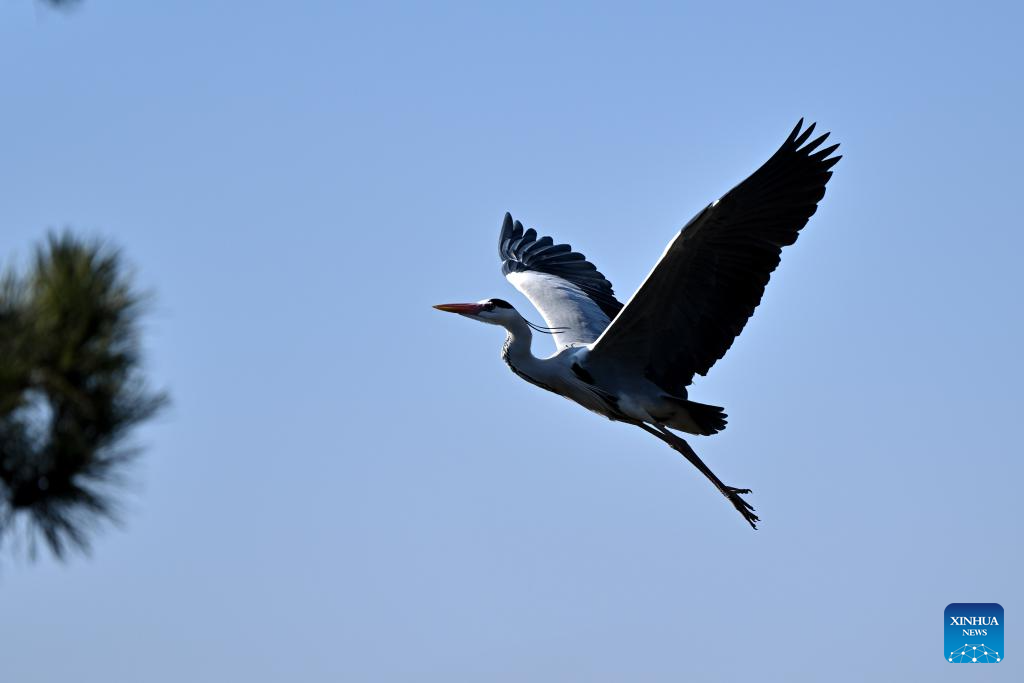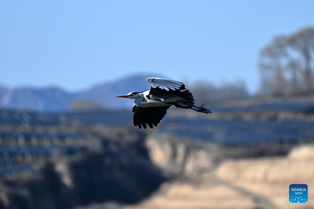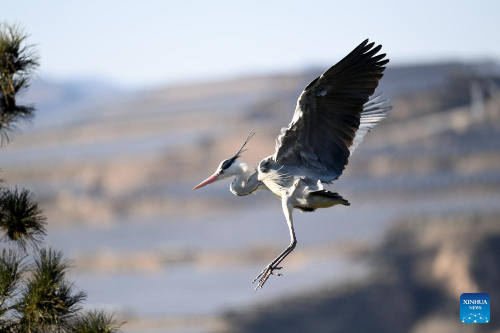 A heron flies in the sky in Jicui Town of Fangshan County, Lyuliang City, north China's Shanxi Province, March 19, 2025. A number of herons migrate to the town to build nests and breed in the spring, generating a unique ecological landscape. (Xinhua/Zhan Yan)