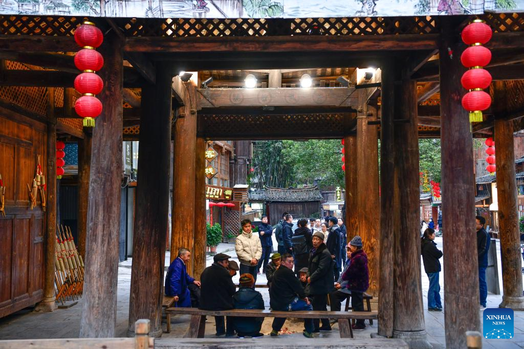 Villagers walk outside the Zhaoxing Dong Village in Liping County of Qiandongnan Miao and Dong Autonomous Prefecture, southwest China's Guizhou Province, March 17, 2025. Located in Liping County of Qiandongnan Miao and Dong Autonomous Prefecture, Zhaoxing Dong Village is home to over a thousand households of the Dong ethnic group. The traditional architectural style and rich cultural heritage of the Dong ethnic group are well-preserved.