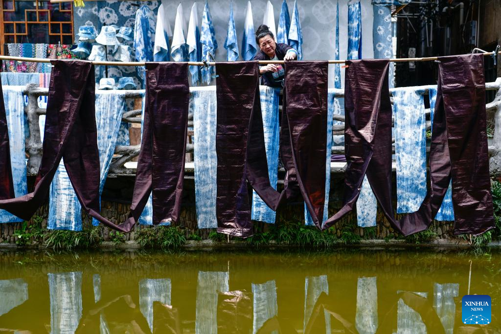 A villager dries traditional Dong cloth at the Zhaoxing Dong Village in Liping County of Qiandongnan Miao and Dong Autonomous Prefecture, southwest China's Guizhou Province, March 18, 2025. Located in Liping County of Qiandongnan Miao and Dong Autonomous Prefecture, Zhaoxing Dong Village is home to over a thousand households of the Dong ethnic group. The traditional architectural style and rich cultural heritage of the Dong ethnic group are well-preserved.