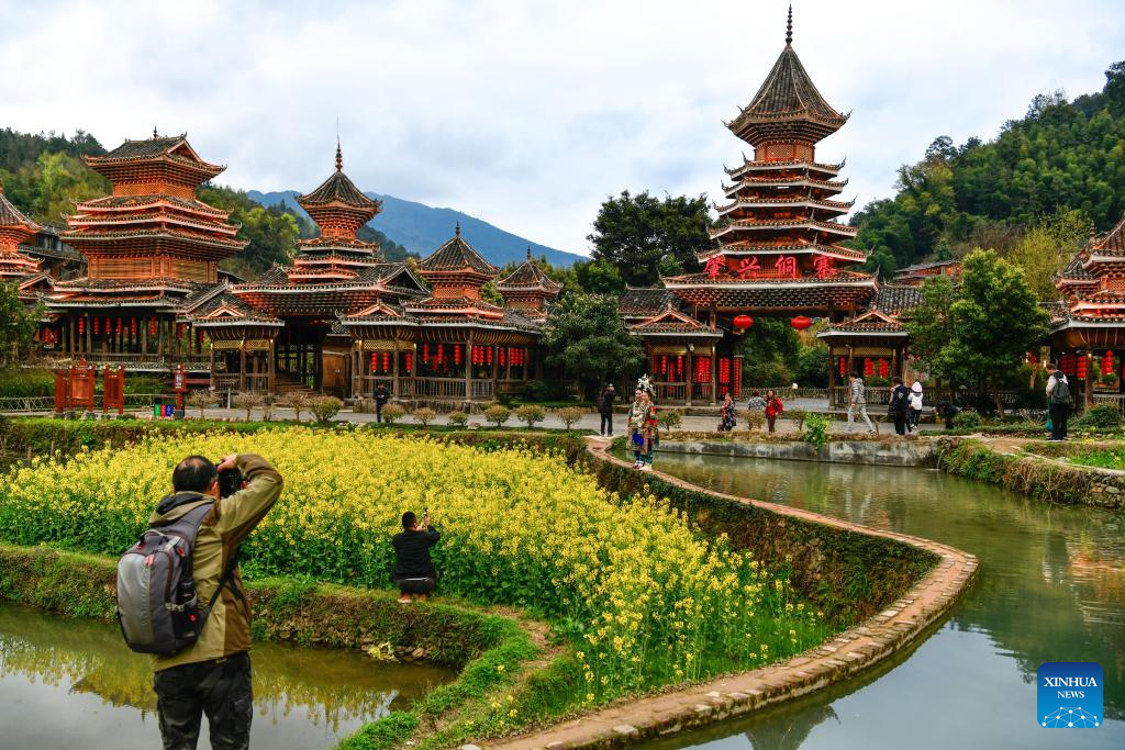 Visitors take photos at the Zhaoxing Dong Village in Liping County of Qiandongnan Miao and Dong Autonomous Prefecture, southwest China's Guizhou Province, March 17, 2025. Located in Liping County of Qiandongnan Miao and Dong Autonomous Prefecture, Zhaoxing Dong Village is home to over a thousand households of the Dong ethnic group. The traditional architectural style and rich cultural heritage of the Dong ethnic group are well-preserved.