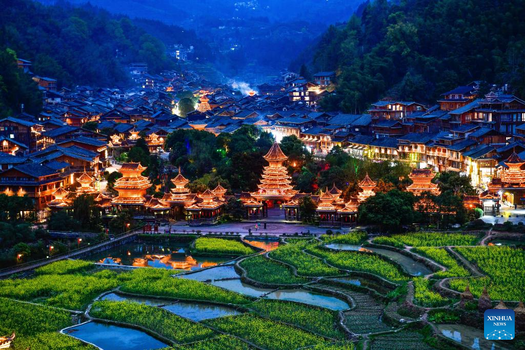 This photo taken on March 17, 2025 shows a night view of the Zhaoxing Dong Village in Liping County of Qiandongnan Miao and Dong Autonomous Prefecture, southwest China's Guizhou Province. Located in Liping County of Qiandongnan Miao and Dong Autonomous Prefecture, Zhaoxing Dong Village is home to over a thousand households of the Dong ethnic group. The traditional architectural style and rich cultural heritage of the Dong ethnic group are well-preserved.