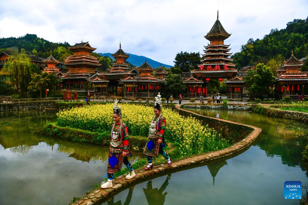 Tourists pose for photos at the Zhaoxing Dong Village in Liping County of Qiandongnan Miao and Dong Autonomous Prefecture, southwest China's Guizhou Province, March 17, 2025. Located in Liping County of Qiandongnan Miao and Dong Autonomous Prefecture, Zhaoxing Dong Village is home to over a thousand households of the Dong ethnic group. The traditional architectural style and rich cultural heritage of the Dong ethnic group are well-preserved.