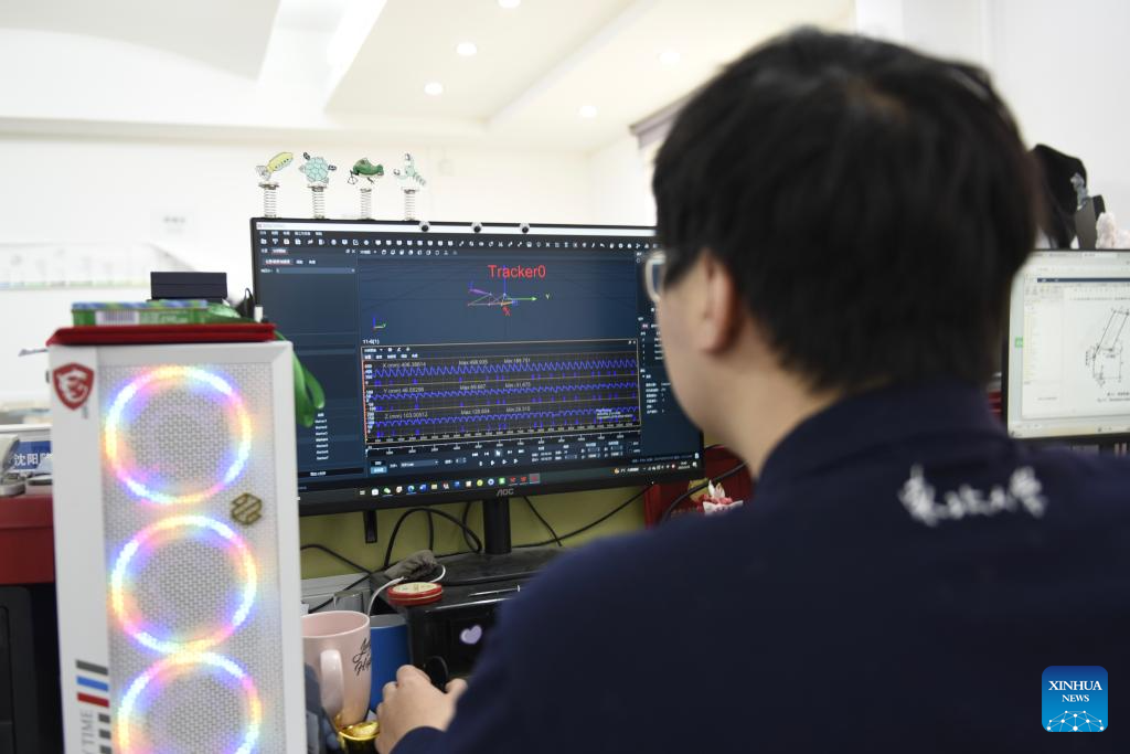 Chu Yichen monitors the motion trajectory of underwater bionic robot at Lindong Bionic technology co., ltd. in Shenyang, northeast China's Liaoning Province, March 18, 2025. (Xinhua/Wu Qinghao)