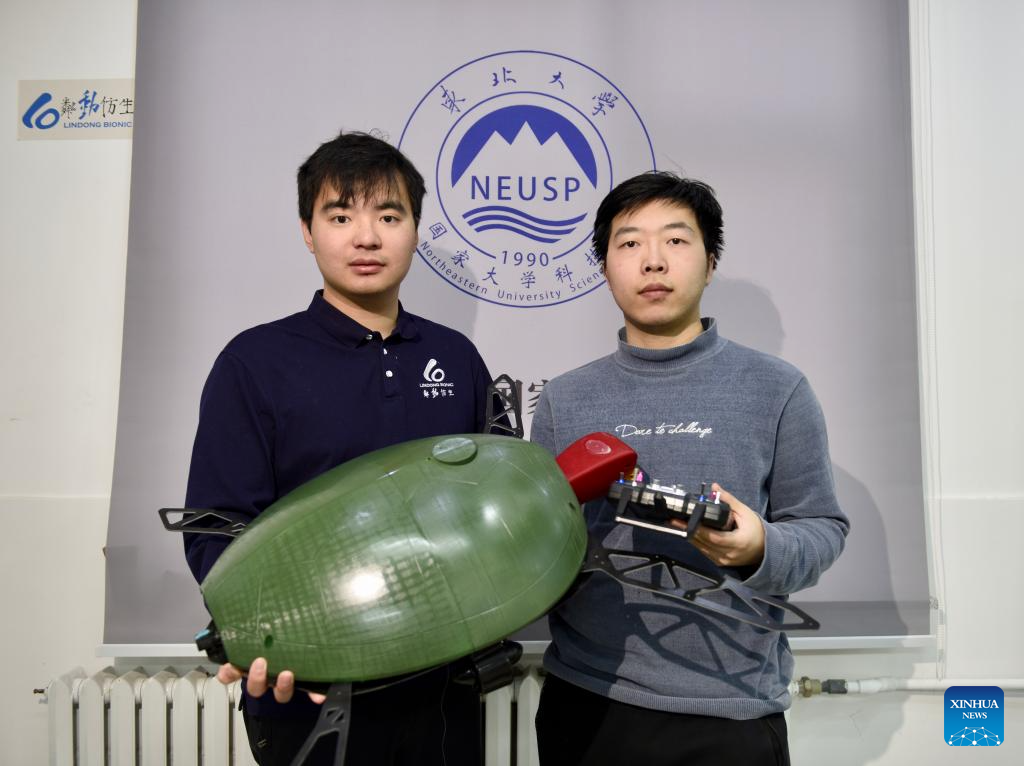 Chu Yichen tests the performance of underwater bionic robot at Lindong Bionic technology co., ltd. in Shenyang, northeast China's Liaoning Province, March 18, 2025. (Xinhua/Yang Qing)