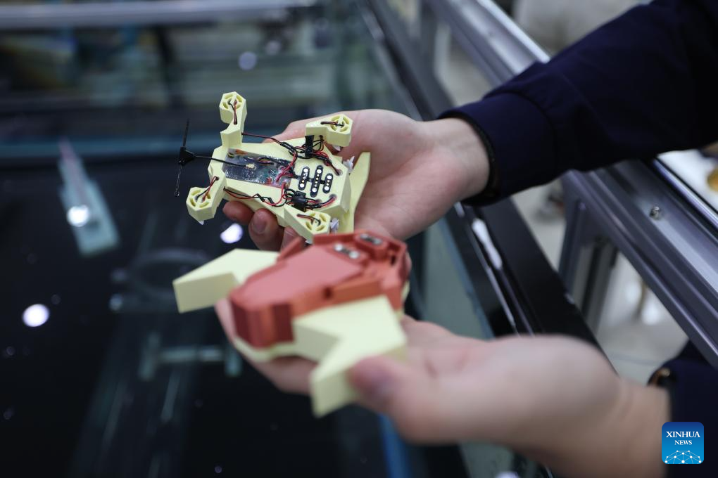 Chu Yichen showcases underwater bionic robots at Lindong Bionic technology co., ltd. in Shenyang, northeast China's Liaoning Province, March 18, 2025. (Xinhua/Yang Qing)