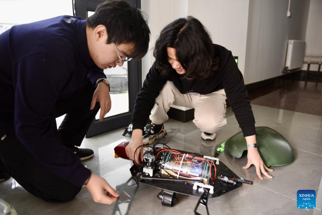 Chu Yichen (L) and his colleague assemble an amphibious bionic turtle robot at Lindong Bionic technology co., ltd. in Shenyang, northeast China's Liaoning Province, March 18, 2025. (Xinhua/Wu Qinghao)