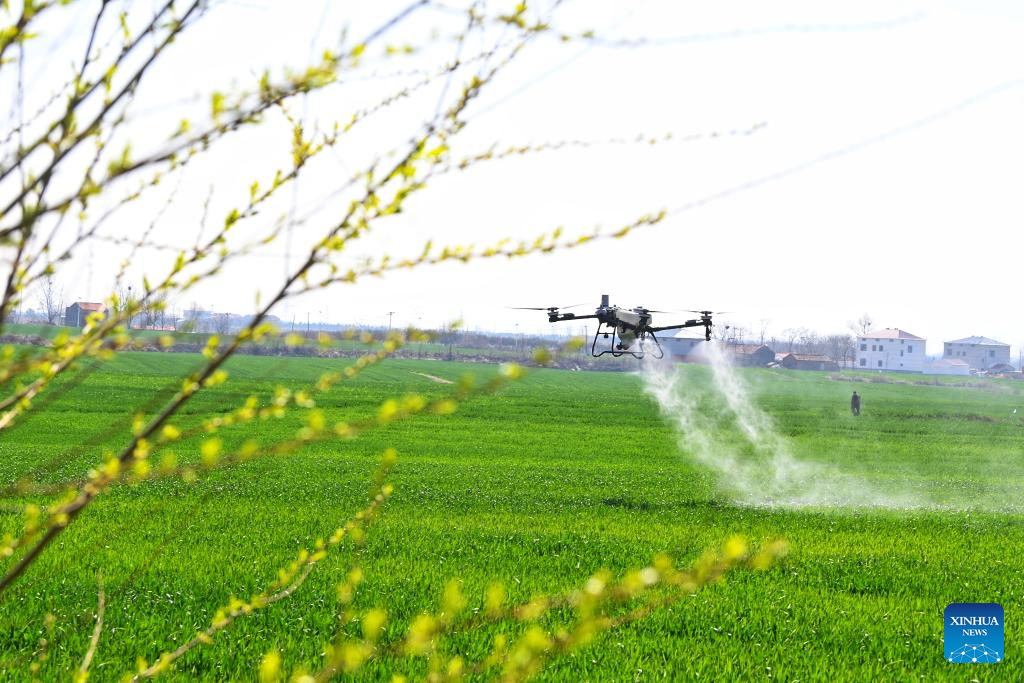 A drone works at a field in Huangwa Village, Xiangyang City of central China's Hubei Province, March 18, 2025. With the approaching of spring equinox, or Chunfen in Chinese, the fourth solar term in the Chinese lunar calendar which will fall on March 20 this year, farmers across the country are busy working at fields. (Photo by Xie Yong/Xinhua)