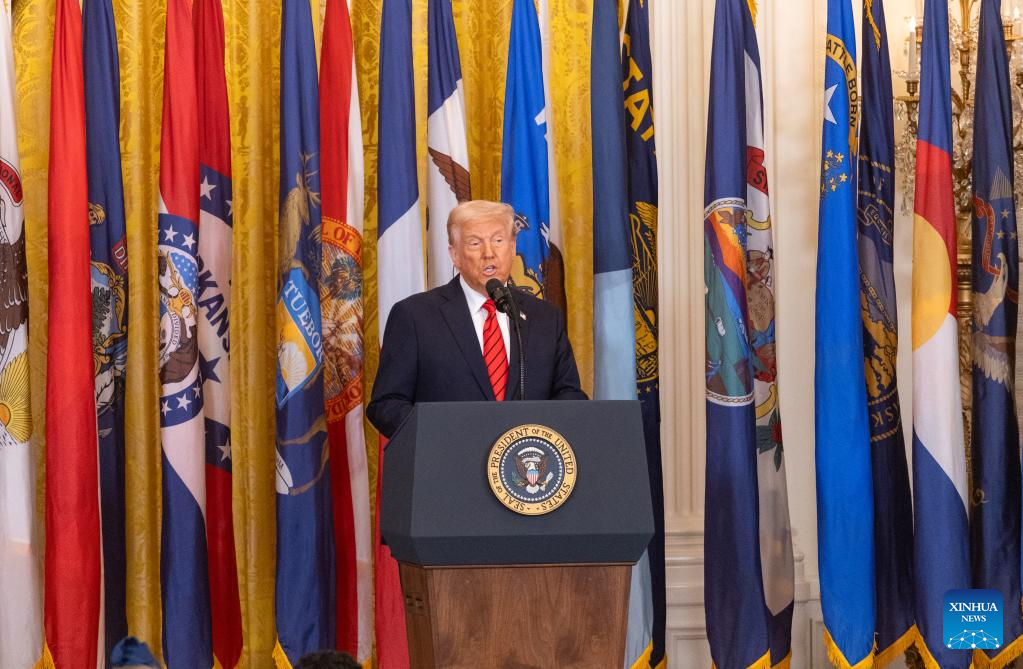 U.S. President Donald Trump speaks before signing an executive order at the White House in Washington, D.C., the United States, on March 20, 2025. Trump on Thursday signed an executive order to formally begin the process of dismantling the Education Department, saying that his administration is returning education back to the states. (Xinhua/Hu Yousong)