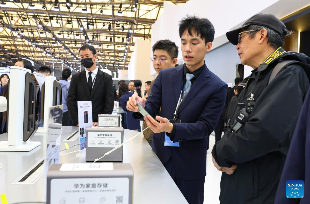 A staff member introduces a data storage device to a visitor during the 2025 Appliance & Electronics World Expo (AWE2025) in east China's Shanghai, March 20, 2025. With the theme of "AI For All", the AWE2025 kicked off here on Thursday. More than a thousand enterprises from all over the world gathered at the expo to showcase their latest innovations. (Xinhua/Fang Zhe)