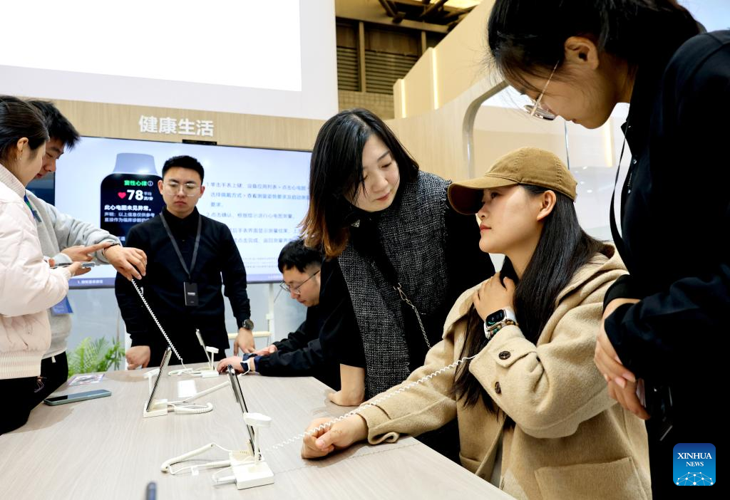 A visitor (2nd R) tests her blood pressure with a smartwatch during the 2025 Appliance & Electronics World Expo (AWE2025) in east China's Shanghai, March 20, 2025. With the theme of "AI For All", the AWE2025 kicked off here on Thursday. More than a thousand enterprises from all over the world gathered at the expo to showcase their latest innovations. (Xinhua/Fang Zhe)