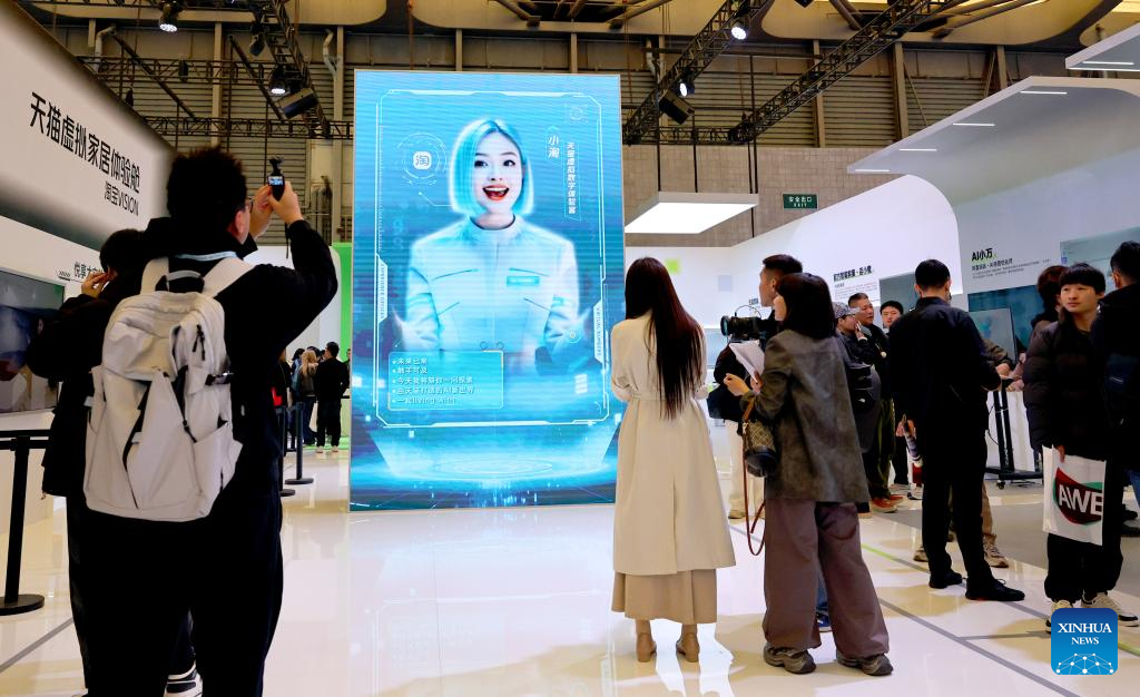 A virtual hostess is seen during the 2025 Appliance & Electronics World Expo (AWE2025) in east China's Shanghai, March 20, 2025. With the theme of "AI For All", the AWE2025 kicked off here on Thursday. More than a thousand enterprises from all over the world gathered at the expo to showcase their latest innovations. (Xinhua/Fang Zhe)