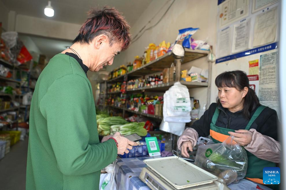 An Jong Euk (L) purchases vegetables at a grocery shop in Urumqi, northwest China's Xinjiang Uygur Autonomous Region, March 18, 2025. Hairdresser An Jong Euk is from Suwon, South Korea, and has been working and living in Xinjiang for more than 20 years. He first worked in a Korean hair salon in Urumqi, where he met his wife Shi Jifang, a colleague at that time. Later, the two of them seized the market opportunity and opened their own hair salon. The hairdresser's business expanded from a small hairdressing store to two large high-end salons in Urumqi's central business district and his hard work of bringing beauty to local residents has won him respect in his community. (Xinhua/Hu Huhu)
