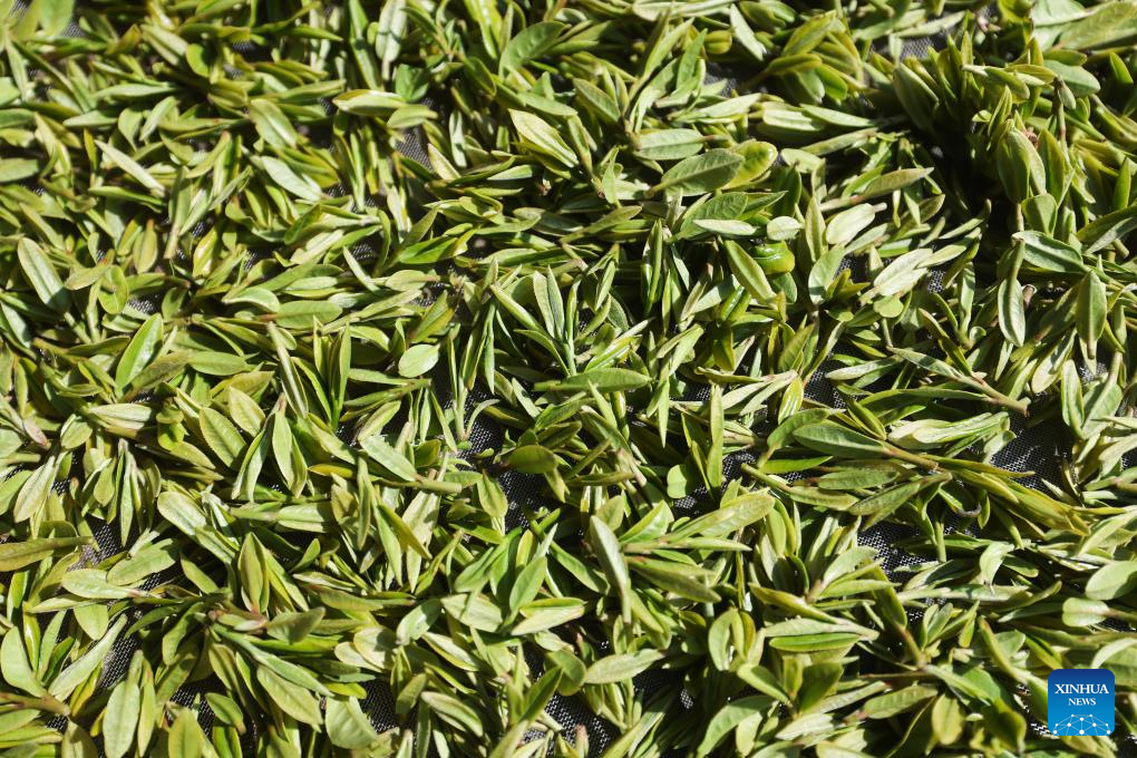 This photo taken on March 20, 2025 shows the newly picked West Lake Longjing tea leaves in Wengjiashan village, the first-class protected area of West Lake Longjing tea base, in Hangzhou, east China's Zhejiang Province. (Xinhua/Xu Yu)