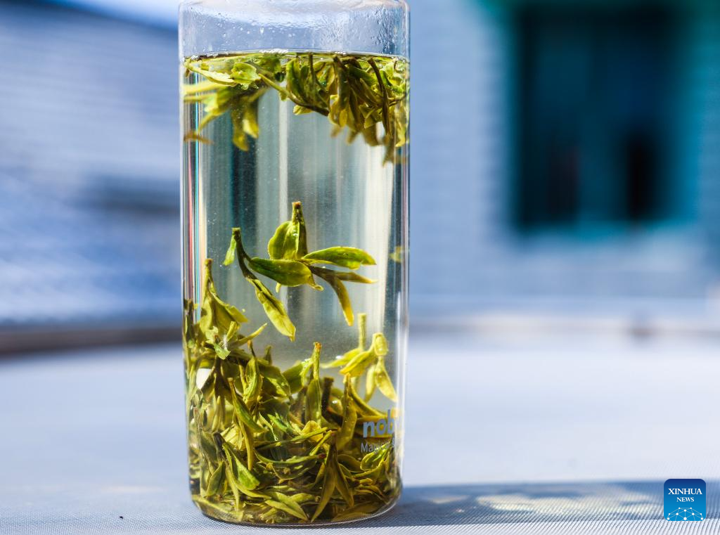 This photo taken on March 20, 2025 shows a cup of brewed West Lake Longjing tea in Hangzhou, east China's Zhejiang Province. (Xinhua/Xu Yu)